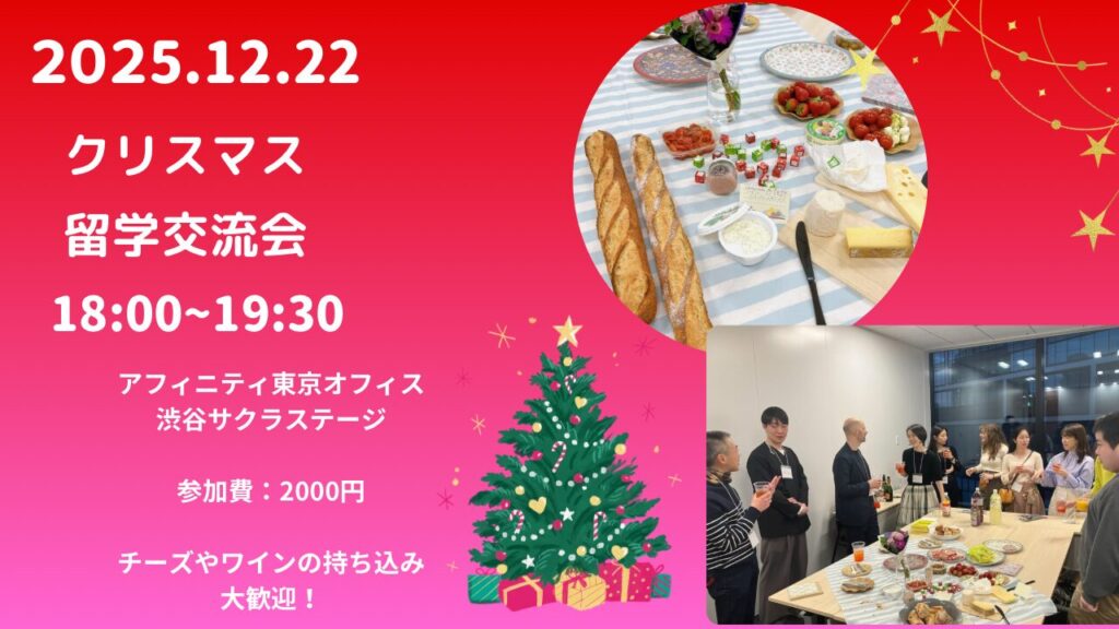 12月22日(月)18時から留学交流会の開催を予定しております!これからフランスへの渡航をご検討中のお客様同士の交流や、留学から帰国された方のお話を聞いてみたい、海外に興味がある方との交流など是非この機会にご参加ください。